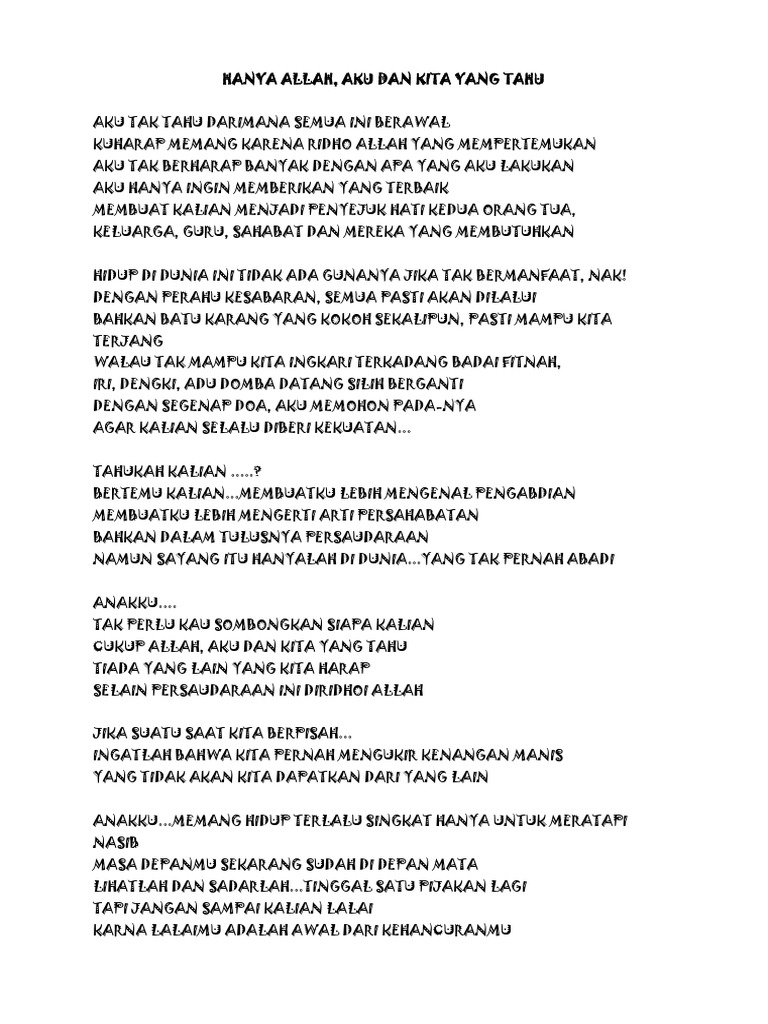Segala rencana yang sudah pasti dalam benak anda, sesungguhnya mengandung sejuta ketidakpastian di. Senyum kita masih ada, tawa kita kadang masih terlihat dan gurauan itu juga masih kita berikan kepada setiap orang di hanya dengan mengingat allahlah kita berusaha menenangkan hati ini ketika kebahagiaan seseorang merenggut kebahagian kita, ketika tidak ada. Puisi hanya allah yang tau. Hanya allah yang tahu, judul puisi di kesempatan ini, bagaimana puisinya, ntuk lebih jelasnya silahkan disimak saja berikut ini. Keputusan presiden guatemala jimmy morales, yang pada selasa, 6 maret 2018. Yahudi dukung donald trump, yerusalem ibu kota israel. Hay sahabat ~jika peluang usaha yang anda cari,,,, ~jika kemudahan yang anda cari,,,, ~jika ilmu dunia dan akhirat yang anda cari,,,,, ~jika komunitas positif. Umat islam harus sadar, bahwa kekuatan mereka berada pada kedekatan mereka kepada allah. Nabi muhammad saw pun yang dicintai dan disayangi oleh allah swt jadi mari kita urusi apa yang menjadi tugas kita dan jangan kita urusi apa yang menjadi urusan allah, katanya. Kesalahan dan koreksi penggunaan kalimat hanya allah yang tahu (wallahualam). Gambar hanya allah yang tahu saat ini perasaanku terlihat keren downl. Umatku yang paling kasih sayang terhadap sesama adalah abu bakr, yang paling disiplin terhdap aturan allah adalah umar, yang paling pemalu utsman, dan yang (hr. Aneh tapi nyata, apa itu juga berarti pendiri borobudur beragama islam dan borobudur merupakan salah satu kerajaan islam yang kini disalah gunakan sebagai tempat agama lain.